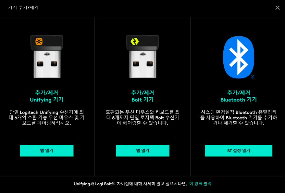 하단의 버튼을 길게 누르면 2.4Gz 무선이 되거나 블루투스등을 사용할 수 있고 한개의 리시버로 로지텍 제품 여러개를 사용할 수 있어요.